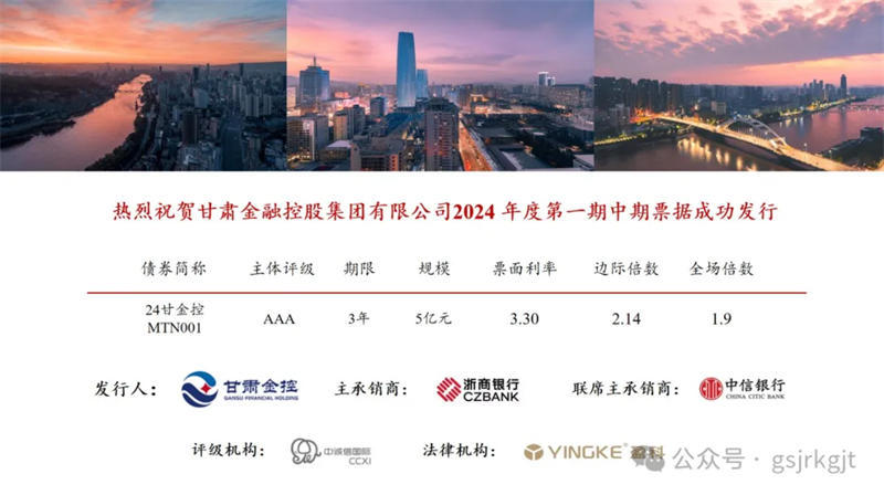 2024年3月28日,甘肅金融控股集團有限公司成功發行2024年度第一期中期票據,發行規模5億元,債券期限三年,票面利率3.3%,債券票面利率創集團近三年同品種債券利率新低。