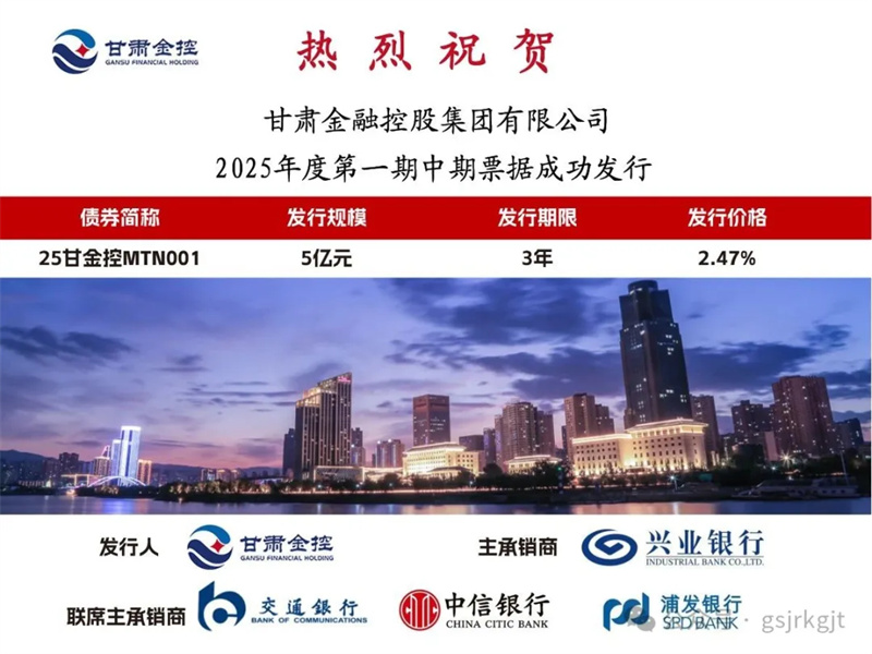 2025年6月10日,甘肅金控集團成功發行2025年度第一期中期票據“25甘金控MTN001”,規模5億元,期限3年,票面利率2.47%,全場倍數2.72倍,體現出市場對集團穩健經營和良好償債能力的信心。