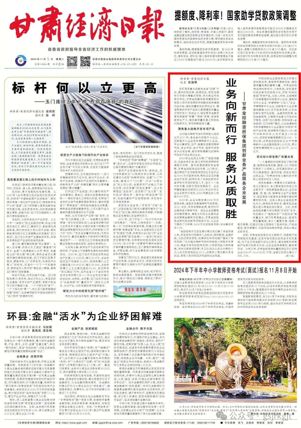 其實,除了“科技創新擔”專項產品外,甘肅金控擔保“設備擔”專項產品,最高擔保額度3000萬元,平均擔保費率1%,重點為工業、交通、農業等全省7大領域符合條件的中小企業提供擔保支持,幫助企業設備更新和技術改造,助力傳統產業煥新升級、新興產業蓬勃壯大,帶動擴大有效投資和市場消費,已為蘭州新區、酒泉等地企業提供擔保3000多萬元。“園區擔”專項產品細則正在加快完善,按照“資源共享、風險共擔、優勢互補”原則,由園區、銀行、擔保協同推進,分層分類滿足園區內初創期、成長期及成熟期企業差異化擔保需求?!班l村振興擔”專項產品已為71戶企業提供擔保2.7億元,助力鄉村產業發展和鄉村設施建設,帶動更多農戶穩定就業和增收致富。
