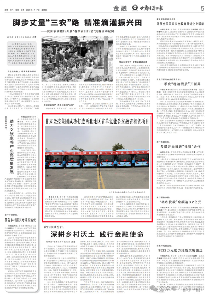 本報蘭州訊(新甘肅·甘肅經濟日報記者 呂霞)近日,甘肅金控集團所屬子公司隴原融資租賃(平潭)有限公司(以下簡稱“隴原租賃”)圍繞“財政+融資租賃”支持縣市區(qū)設備更新,向慶陽市公交集團投放8800萬元融資租賃款,用于購置50輛氫能源公交車,成功打造西北地區(qū)首單氫能公交融資租賃項目,開啟城市公共交通綠色低碳新征程。