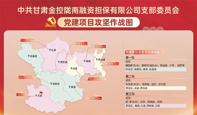 為扎實推進“三抓三促”行動,全面落實集團黨委黨建標準化、信息化、項目化、清單化建設要求,以高質量黨建引領高質量發展,金控隴南擔保創新“1+2+5”工作模式,全面打響黨建項目化攻堅戰。