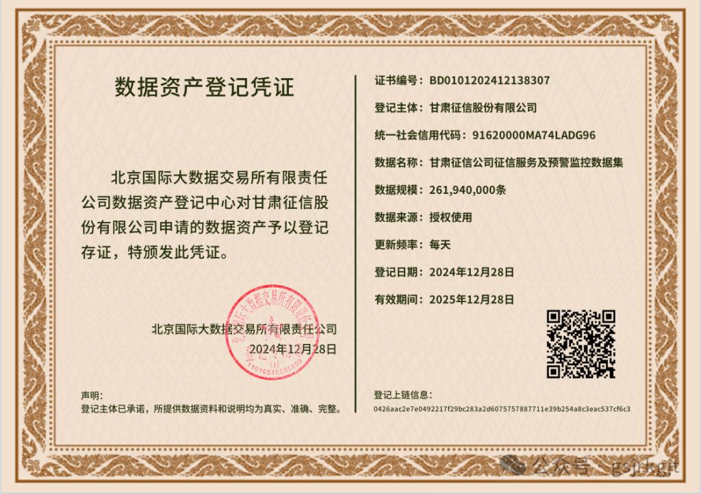 近日,甘肅征信成功完成首單數(shù)據(jù)資產(chǎn)入表工作。“甘肅征信公司征信服務(wù)及預(yù)警監(jiān)控數(shù)據(jù)集” 數(shù)據(jù)產(chǎn)品順利通過北京國際大數(shù)據(jù)交易所審核公示,取得數(shù)據(jù)資產(chǎn)登記憑證(證書編號:BD0101202412138307),成為甘肅省省內(nèi)首例以征信數(shù)據(jù)實(shí)現(xiàn)數(shù)據(jù)資產(chǎn)入表的省屬國有企業(yè)。