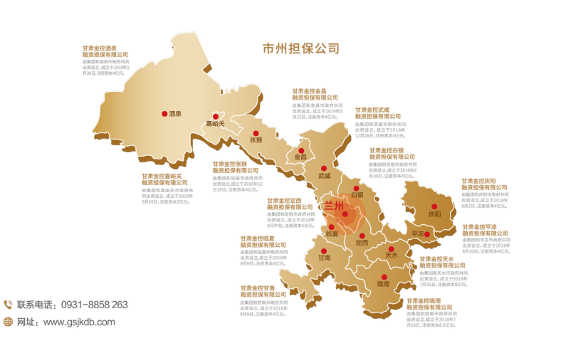 甘肅金控融資擔保集團股份有限公司(簡稱金控擔保)是由甘肅省財政廳出資,甘肅金融控股集團有限公司發起,經甘肅省地方金融管理局核準而設立的省級政府性融資擔保機構,甘肅省人民政府確定的省級融資再擔保機構,國家融資擔保基金簽約合作單位。連續四年資本市場主體信用AAA評級為穩定,連續五年榮獲甘肅省“省長金融獎”,被評為甘肅省先進基層黨組織、省屬企業黨建融入生產經營典型創建示范點、“萬企興萬村”甘肅行動典型金融機構、首屆“甘肅社會責任企業”。
